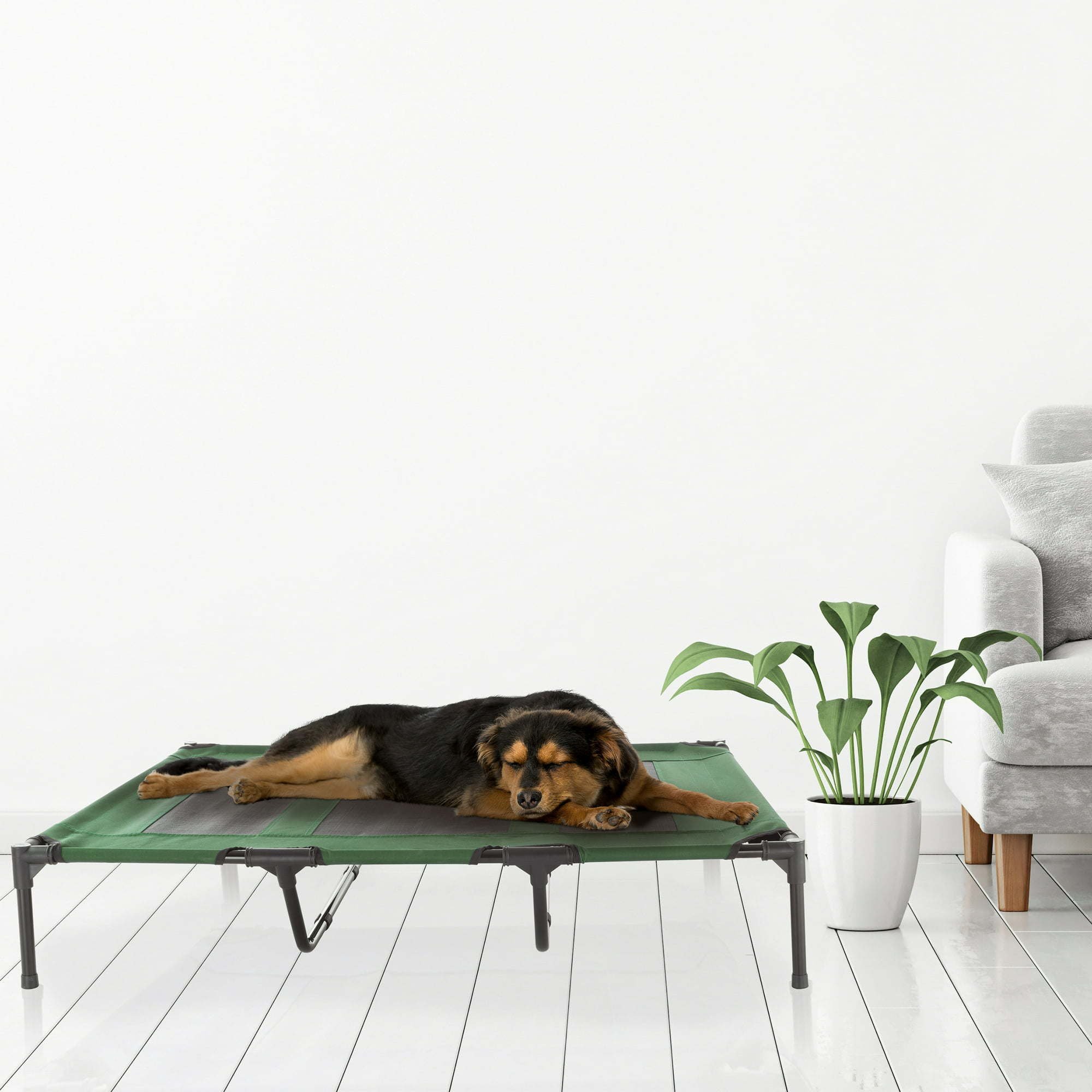PRODUCT DETAILS - Materials: Mesh, Coated Steel, PVC Connectors, and Water-Resistant Canvas. Dimensions: (L) 48'x (W) 35.5' x (H) 9'. XL Dog Bed Carrying Case Included. For pets up to 110lbs. Color: Green.