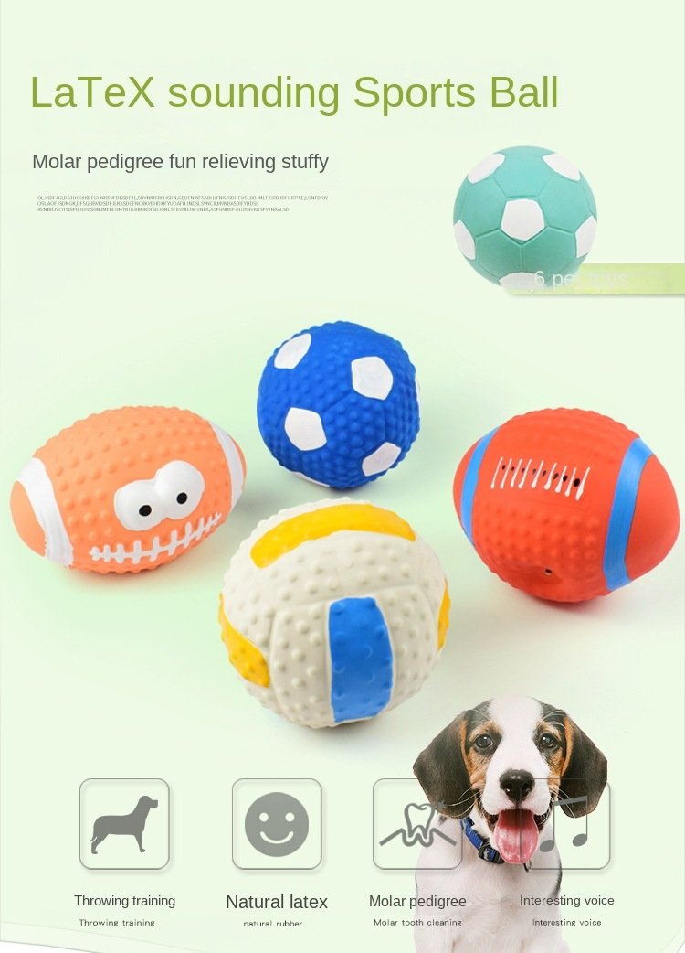 NON-TOXIC & DURABLE: Squeaky dog toys balls comply with the exact same safety standard as children’s toys. These small squeaky balls for dogs are no harmful chemicals such as BPA; lead; or phthalates in our toys. Charming pet latex dog toy are bouncy enough to excite your pet and stretchy enough for him/her to get a good grip with mouth.SOFT NATURAL RUBBER: Natural Soft Dog Toys Ball are made from 100% natural rubber latex. It is very pliable and a soft but durable latex on dog’s teeth; jaws and mouth. Dog squeaky chew toy ball is durable and will simply reinflate after your dog grabs it. It's also easy to clean.PERFECT FOR SMALL MEDIUM DOGS BUT NOT AGGRESSIVE CHEWERS: This soft; bouncy; squeaky rubber ball is 2.95 inches in diameter. It’s flexible enough for my small dog to grab comfortably. The weight of it is nice too; being just heavy enough that you can throw it well.PERFECT FOR PLAYING FETCH: This popular; squeaky dog toy is fun to play fetch with because of the ball shape (Yellow Soccer Ball; Volleyball; American Football; Blue Soccer Ball); it bounces unpredictably and surprises your dogs. They will absolutely LOVE playing with and chasing this soft; squeaky and bouncy ball; which will entertain your pup for hours. The perfect gift for every dog and dog lover in your life.GREAT VALUE & FUN: Dog Fetch Toy Ball Built-in Squeaker Makes Noise to Pique Dogs Curiosity; and Appeals to Their Natural Instincts to Hunt. Your pets will completely addicted to these small squeaky balls.